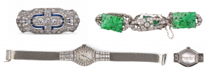 A jadeite and diamond bracelet, composed of three bright apple green pierced foliate rectangular shaped jadeite panels, with arched diamond connecting links and three diamond plaque links, has an estimate of £5,000-7,000, while a fine sapphire and diamond plaque brooch, of architectural design, set throughout with baguette and brilliant cut diamonds, and mounted in platinum, has a guide of £3,000-4,000.